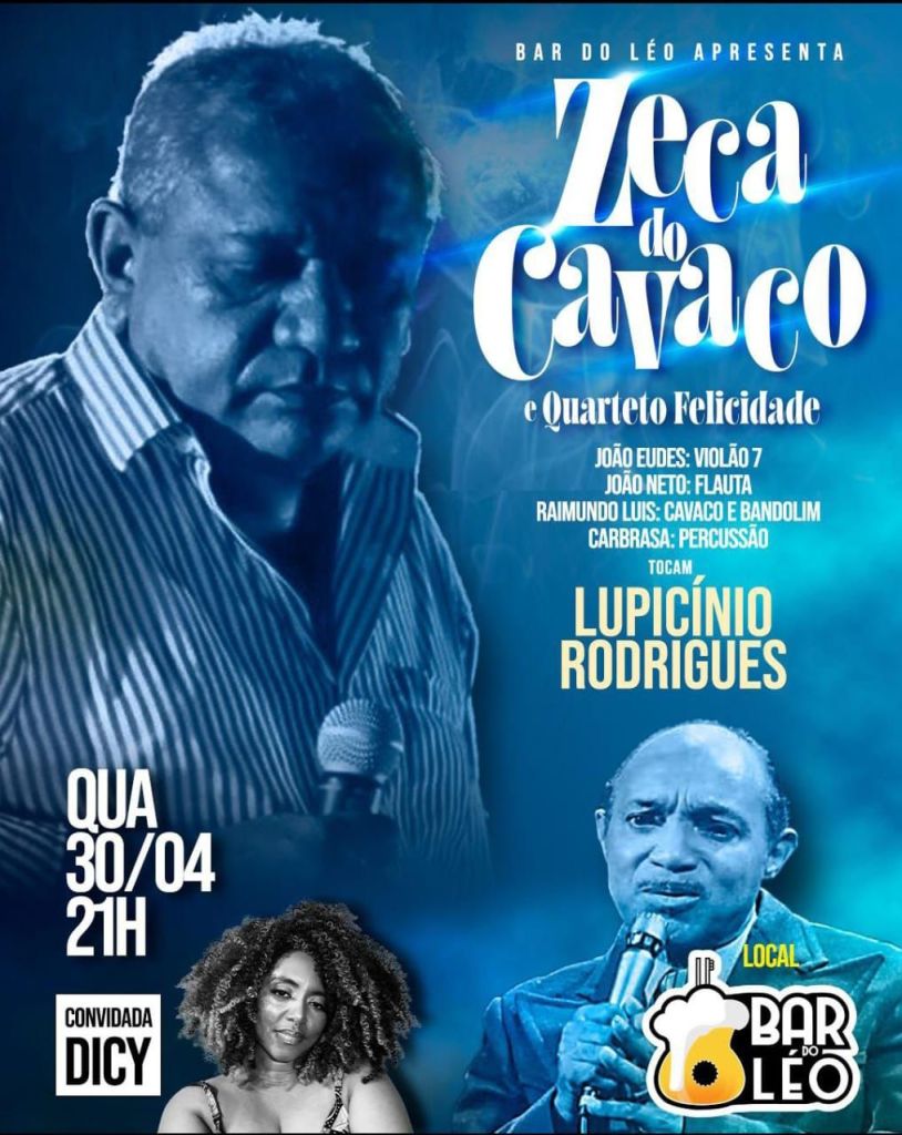 Pois muito bem, um ano depois daquela sessão marcante, me pego novamente empolgado com uma homenagem ao homem que cunhou a expressão “dor de cotovelo” e compôs o hino do Grêmio. Desta vez, Zeca do Cavaco comanda a celebração em formato de show, a ser realizado hoje, véspera do Dia do Trabalhador, a partir das 21h, no Bar do Léo. Atenção para o elenco, denominado Quarteto Felicidade: João Eudes (sete cordas), João Neto (flauta), Raimundo Luís (cavaco e bandolim) e Carbrasa (percussão), além de Dicy Rocha como convidada especial.