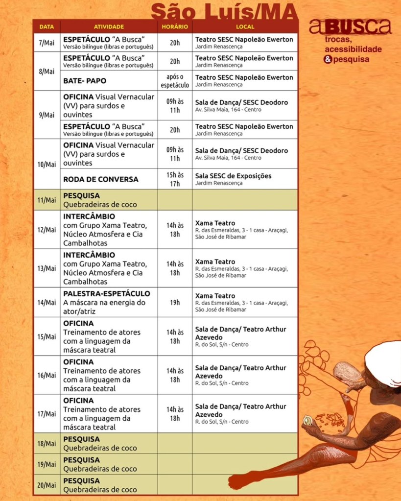 Entre as atividades previstas, inclui-se uma série de encontros com quebradeiras de coco-babaçu, com o intuito de “conhecer mais sobre os saberes dessas mulheres e buscar inspiração para concluir a nossa trilogia de espetáculos sobre a ancestralidade feminina”, conforme explica Venício Fonseca, um dos fundadores do grupo. Os outros dois espetáculos da trilogia mencionada pelo artista são Imagens da Quimera (2003) também exibido em São Luís, além de A Busca, recém-apresentado na capital maranhense.